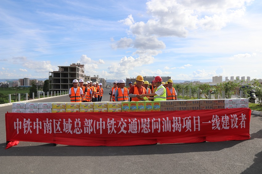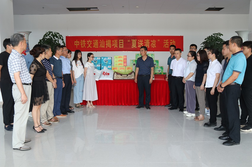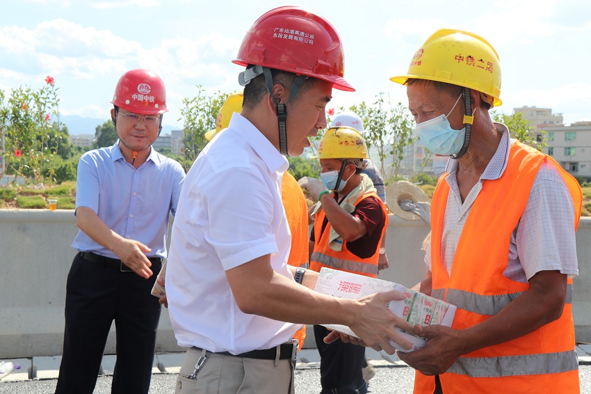 7月,集團(tuán)公司副總經(jīng)理劉寧到汕揭項(xiàng)目為在高溫地區(qū)作業(yè)的一線建設(shè)者送清涼,將飽含關(guān)懷的清涼用品遞給每一位一線建設(shè)者,并仔細(xì)了解、問候他們的工作生活情況。