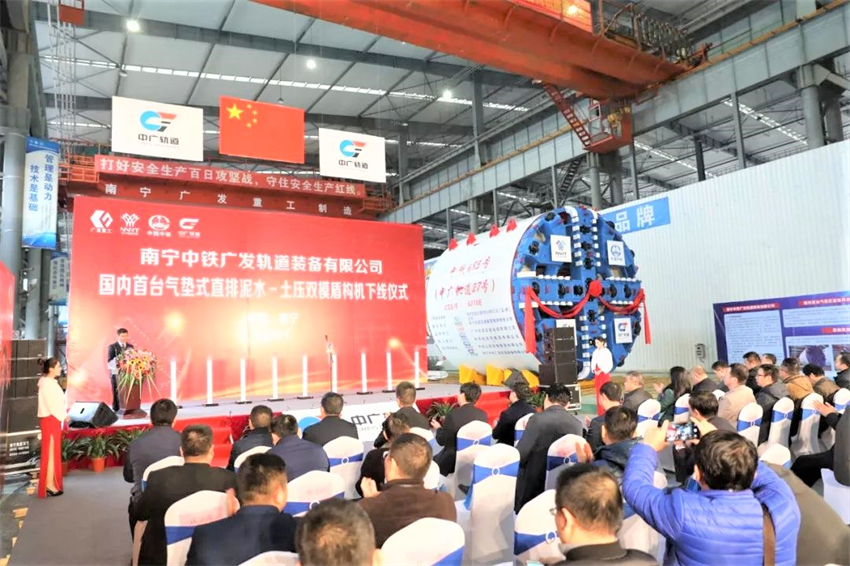 ▲國內(nèi)首臺氣墊式直排泥水—土壓雙模盾構(gòu)機在南寧下線