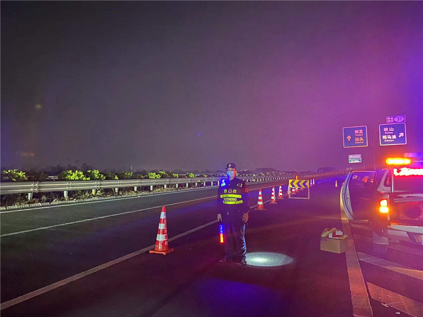 ▲路政員圍蔽引導(dǎo)交通
